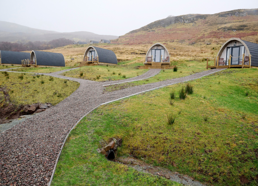 Groundworks contractor Easgaidh faced the task of creating gravel pathways to link a series of hillside cabins with a luxurious lobby building and car park on the Isle of Skye.